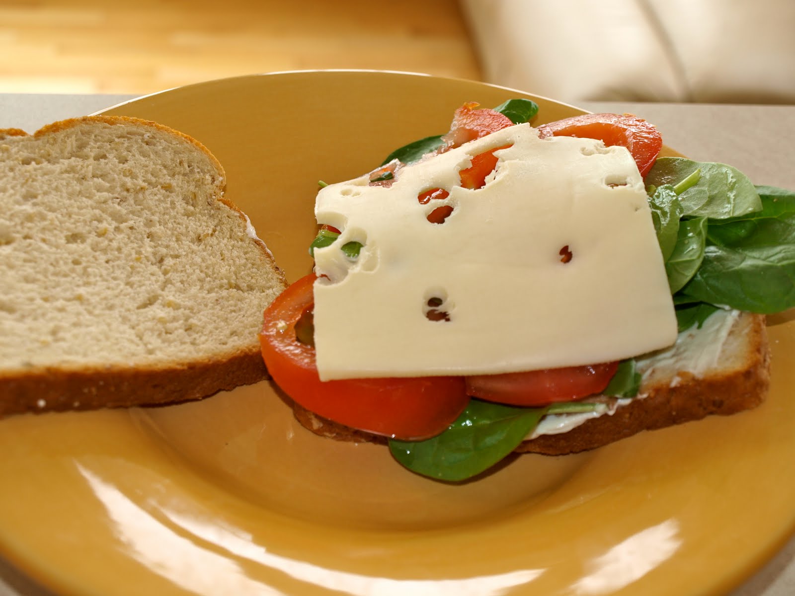 Oat Nut bread, baby spinach, a tomato, baby swiss cheese, and some Veganaise (vegan mayo).